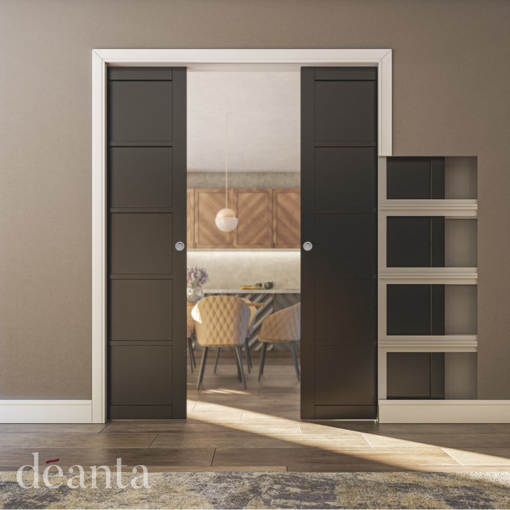 - Create a feature with the Double Pocket Door Kit, leading from a dining room to a living room or kitchen