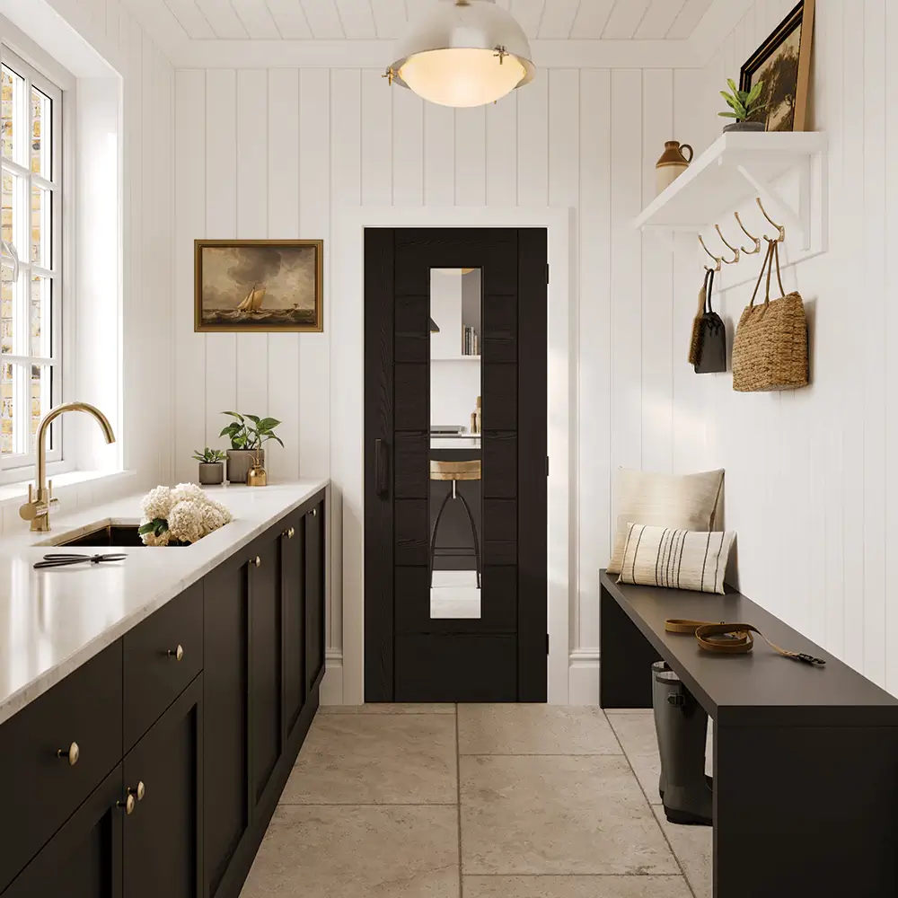 This unique LPD Linear Laminate Glazed Door 7P Black colour adds a modern flair to the interior. Featuring bold vertical panels of clear glass that add sophistication while increasing natural lighting. This door seamlessly integrates style and functionality, making it the ideal addition for modern homes. This sleek modern design makes a statement in any living room, hall, or dining area; creating privacy while still creating connectivity between rooms.